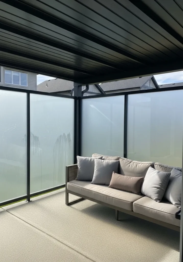 This sleek covered patio uses frosted glass panels to create a protected and secluded seating area. The dark metal roof structure adds contrast and a contemporary edge, while the soft gray outdoor sofa keeps the space cozy and understated. The frosted walls filter natural light without sacrificing privacy, making the patio usable in different weather conditions. The neutral flooring ties everything together and keeps the focus on clean lines and modern comfort.