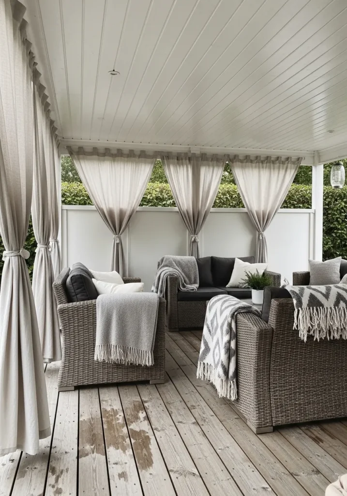 This bright covered porch feels airy and welcoming with its white paneled ceiling and soft neutral palette. Flowing outdoor curtains frame the space, creating a gentle sense of enclosure while still allowing light to pass through. Woven armchairs with cozy throws surround a central coffee table, all set on weathered wooden decking that adds charm and texture. The open railing keeps the connection to the yard while maintaining a subtle boundary.