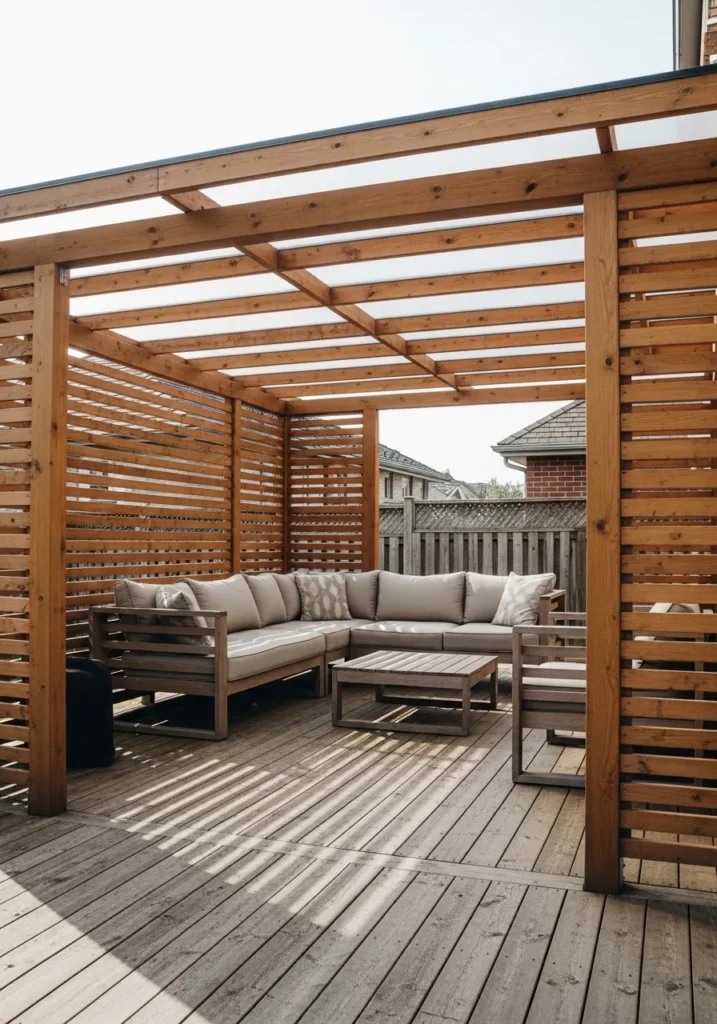 I adore how this design balances openness and seclusion so effortlessly. The slats create beautiful shadow patterns that shift throughout the day. It feels structured yet cozy, which is such a lovely combination. I can easily imagine unwinding here after a long day and feeling completely tucked away in my own little outdoor retreat.
