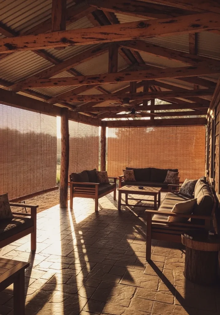 This covered patio showcases a rich wooden structure with exposed beams that give it a cozy cabin vibe. Slatted wooden screens along the sides provide filtered light and privacy while still allowing airflow. The warm tones of the timber create a welcoming glow, especially when the sunlight streams through and casts soft shadows across the stone flooring. Comfortable seating arranged in a conversational layout makes the space ideal for gathering and relaxing.