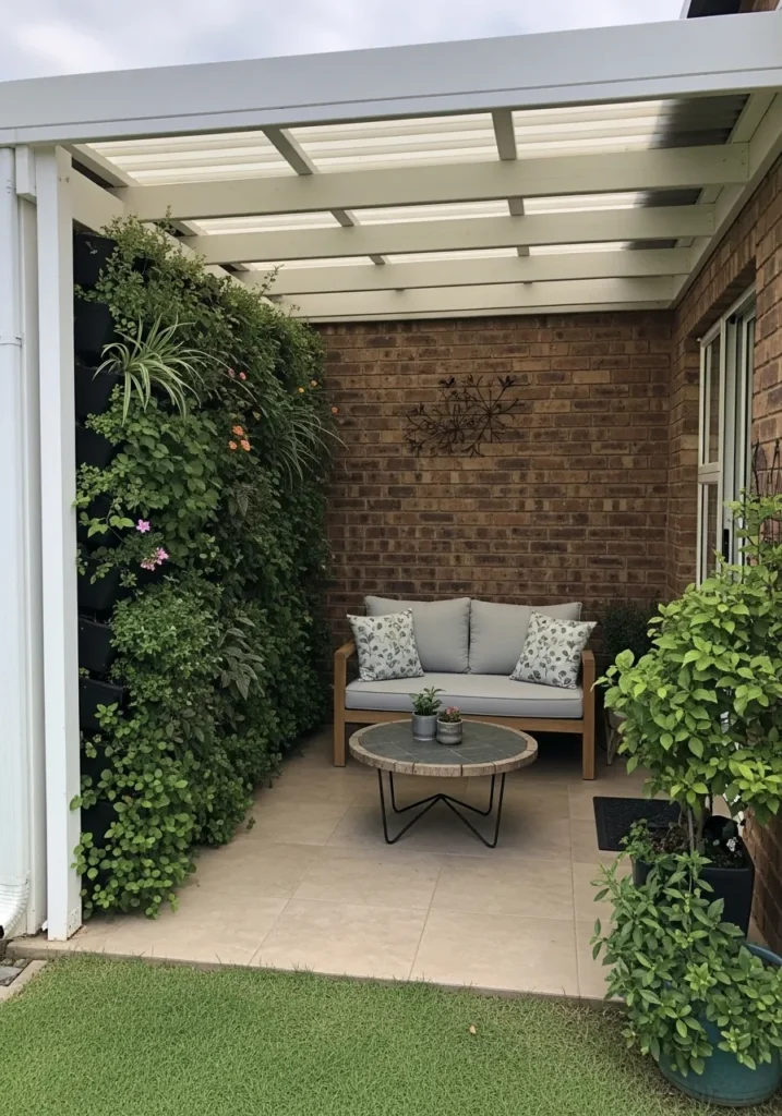 This covered patio corner feels intimate and thoughtfully styled with its clean white roof panels and warm brick backdrop. A compact outdoor sofa sits neatly against the wall, paired with a simple round coffee table that keeps the layout light and uncluttered. One side is softened by a lush vertical garden, adding texture and natural privacy without taking up floor space. The neutral flooring and subtle greenery make the space feel calm and balanced while still practical for everyday lounging.