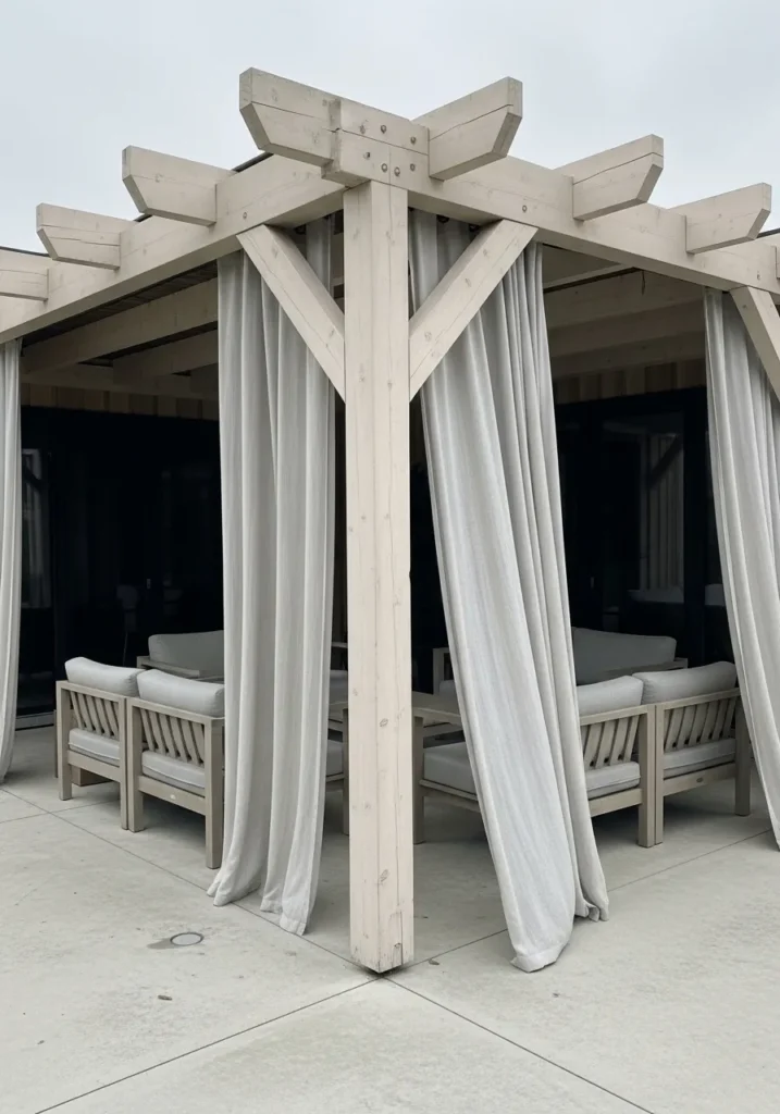 This covered patio design features a sturdy light wood pergola structure with soft white drapes cascading from each corner. The curtains create a gentle sense of enclosure while still allowing air and light to pass through. Inside, a low outdoor daybed style seating arrangement adds comfort and a resort inspired feel. The neutral tones and clean lines keep everything serene and cohesive, making the space feel like a private outdoor retreat.