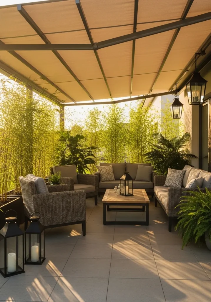 This covered patio uses a soft fabric canopy to filter sunlight while offering solid protection from the elements. The neutral outdoor seating is arranged around a central coffee table, creating a welcoming conversation area. Tall bamboo plants line the perimeter, providing natural privacy and a fresh green backdrop. Lanterns and potted plants add cozy details that make the space feel layered and thoughtfully styled.