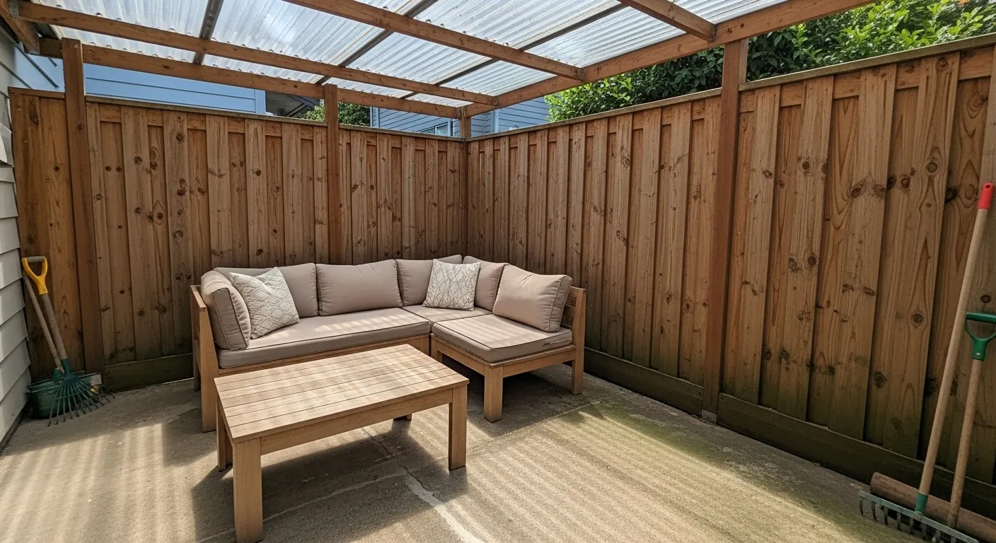 This covered patio tucks neatly into a corner, surrounded by tall wooden fencing that creates a strong sense of enclosure. A transparent roof lets sunlight filter in while still offering protection from rain. The sectional seating fits perfectly against the fence, maximizing space without feeling crowded. A simple wooden coffee table keeps the look balanced and practical.
