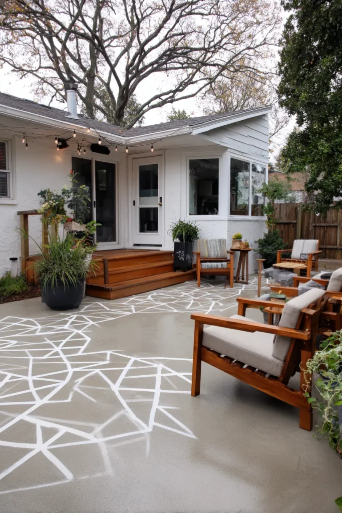 I think this design is just absolutely adorable and it proves you don’t need a massive budget to have a stunning outdoor space. I especially love how they’ve used the concrete to create that incredible pattern; it gives the patio so much character and feels totally custom, not cookie-cutter at all. The entire area has such a warm, inviting feel, making me picture myself spending all my weekend mornings out there sipping coffee and reading. It’s definitely a home that’s full of sweet, approachable style.