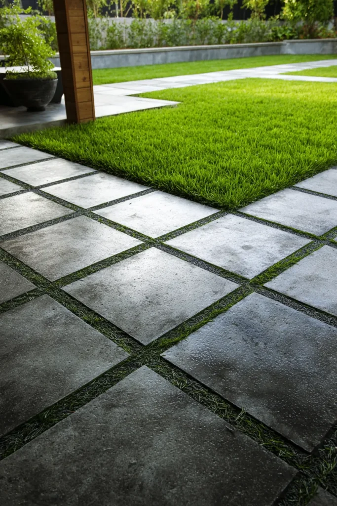 This striking design features a contemporary take on a paved patio by using large, square concrete pavers separated by clean joints filled with strips of lush green grass. This grid pattern creates an immediate sense of modern order and adds a wonderful, organic texture that softens the look of the concrete. The large paver size and clean lines complement the surrounding manicured lawn, giving the whole backyard an incredibly structured, high-end feel. It’s a fantastic way to blend hardscaping and softscaping beautifully.