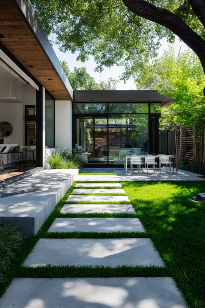 This design features a stunning minimalist and modern aesthetic, showcasing the clean integration of hardscaping and softscaping. The home itself has contemporary lines and expansive glass to maximize light. The patio area is created using large, generously spaced concrete pavers that appear to float over lush, well-manicured grass. This stepping stone effect creates a dramatic visual path, connecting the main living space to the rest of the yard while softening the hard edges of the concrete with the surrounding greenery.