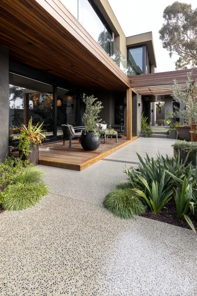I just love how this design feels like a luxurious, seamless transition from inside to out; that wooden overhang is an absolute dream for year-round shelter. The textural contrast between the smooth wood and the grainy, almost pebbled concrete/gravel is so appealing and visually interesting. I think the different levels and materials make the space feel much more custom and dynamic. It’s an incredibly chic and relaxed design that’s just begging for a quiet afternoon spent relaxing outdoors.