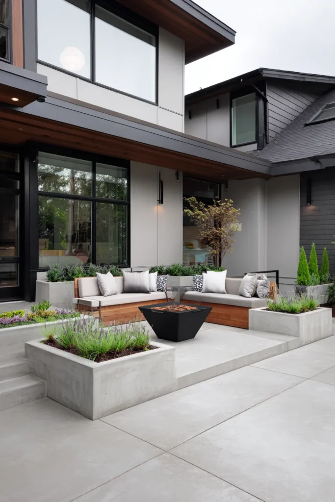 This dramatic backyard space is designed as a modern outdoor living room, perfectly complementing the sleek, dark-trimmed contemporary home. The entire lounge area is anchored by a large, square poured concrete patio and features striking built-in concrete benches and planters. The centerpiece is a fabulous gas fire pit, making it the ultimate gathering spot. This use of integrated, light gray concrete gives the space an incredibly tailored, high-end, and permanent feel, emphasizing clean lines and structured comfort.