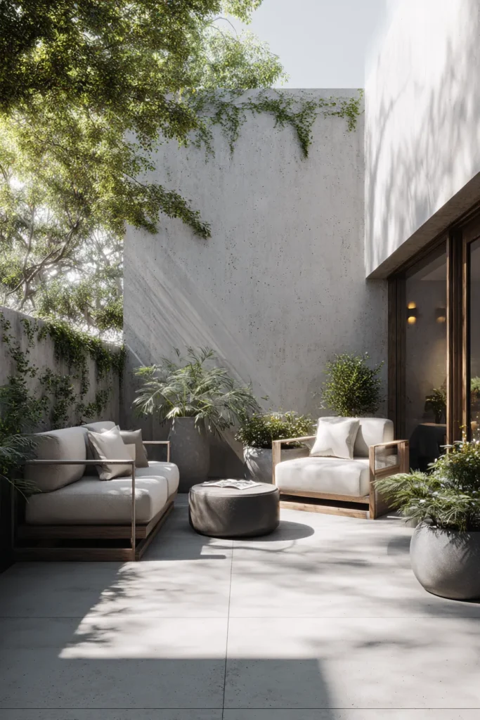 This design is all about creating an intimate, protected urban courtyard that offers maximum privacy. The space is surrounded by tall, light-colored walls, likely finished in stucco or smooth concrete, giving it a bright, enclosed, and calm feeling. The entire floor is a uniform, smooth concrete patio, providing a clean, clutter-free foundation. With simple, comfortable furniture and tall greenery tucked into the corners, the area is transformed into a peaceful, sun-drenched outdoor retreat.