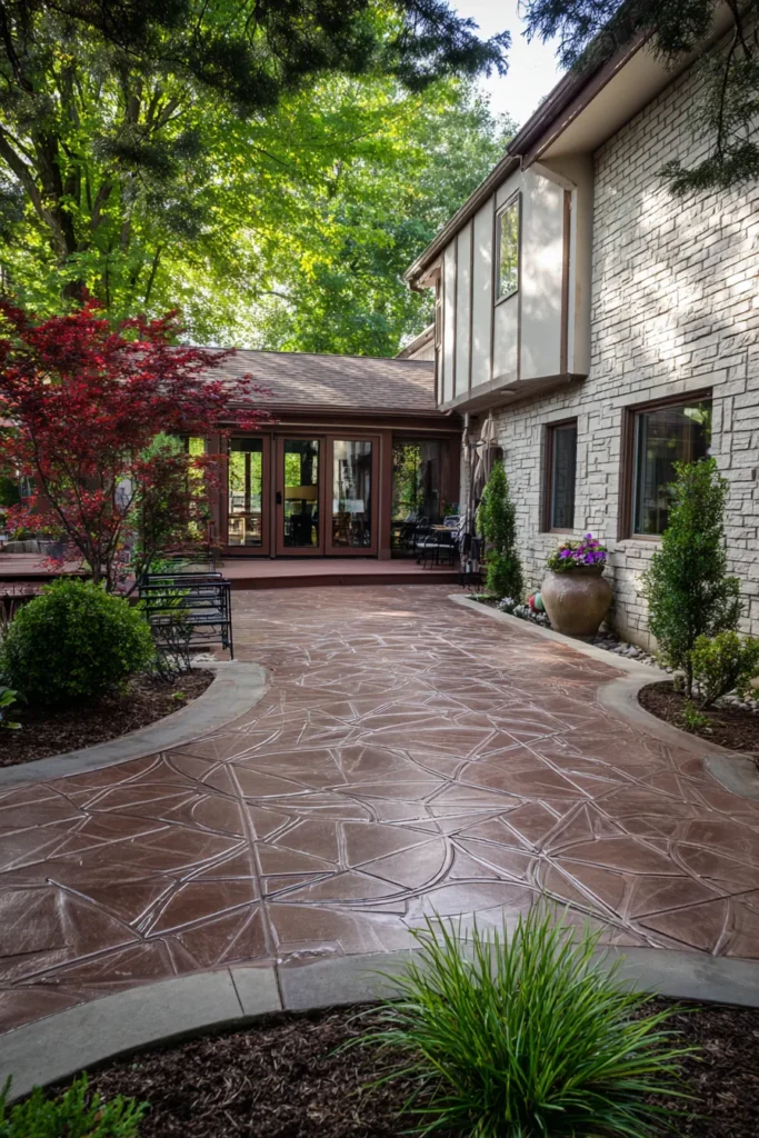 I think this patio is just a masterpiece in camouflage; it achieves the rustic, high-end look of stone but with the durability and affordability of concrete. I love how the winding path feels organic and inviting, leading your eye through the gorgeous landscaping. The rich colors used in the staining are so warm and lovely, making the whole outdoor area feel incredibly established and welcoming. It’s a fantastic design for anyone who wants that classic, charming look without the hefty price tag of natural stone.