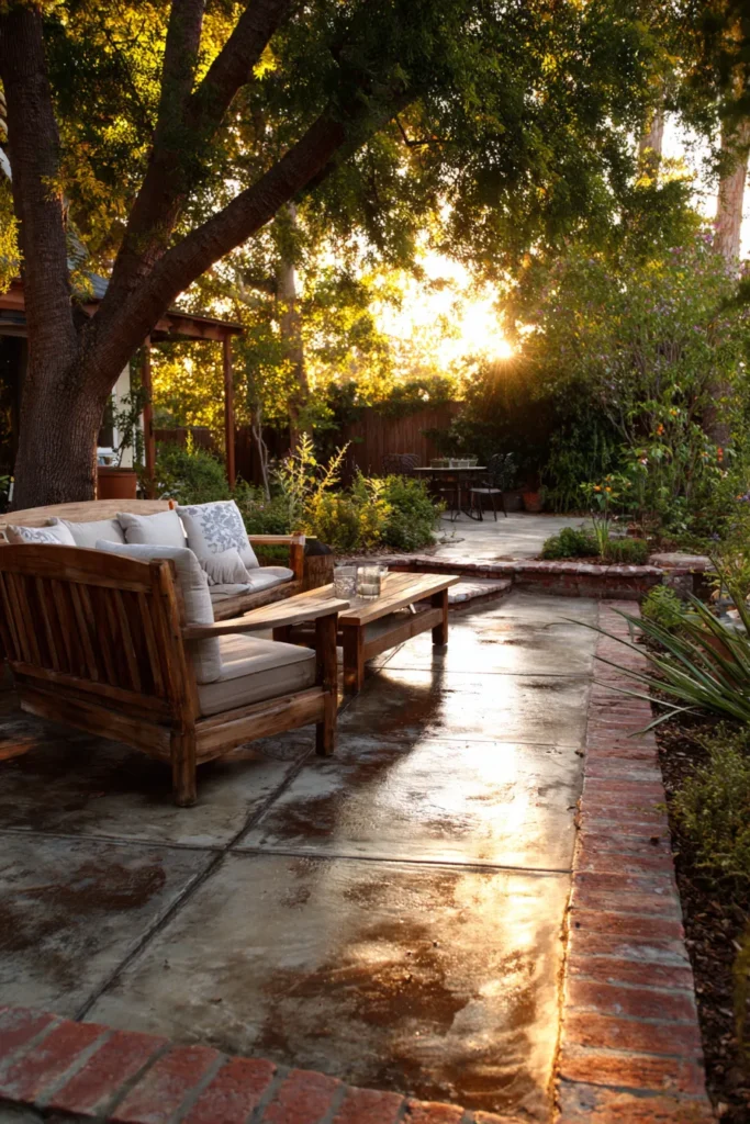 I absolutely adore the warm, magical light in this photo and how the patio surface just seems to soak it all up. The rich color they chose for the concrete stain is just stunning; it completely elevates the material and gives the whole area such a cozy, sophisticated vibe, not cold or gray at all. I think the combination of the rustic wooden furniture and the dramatic shadows from the trees makes it feel like the ultimate, peaceful spot to unwind at the end of a long day. It’s definitely a design that whispers “home sweet home” in the most enchanting way.