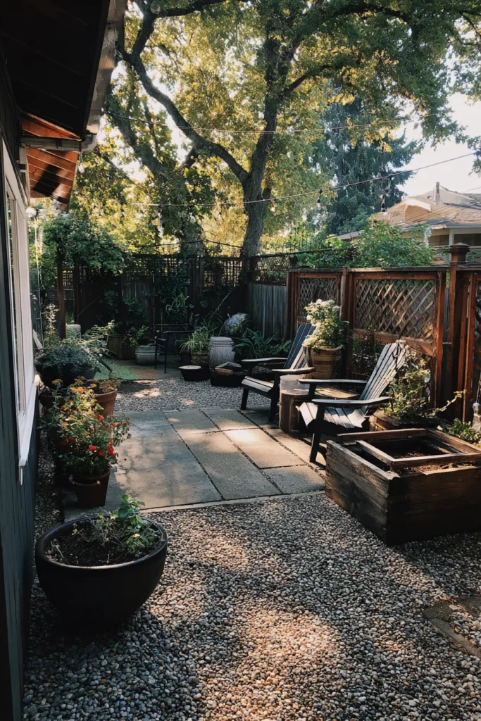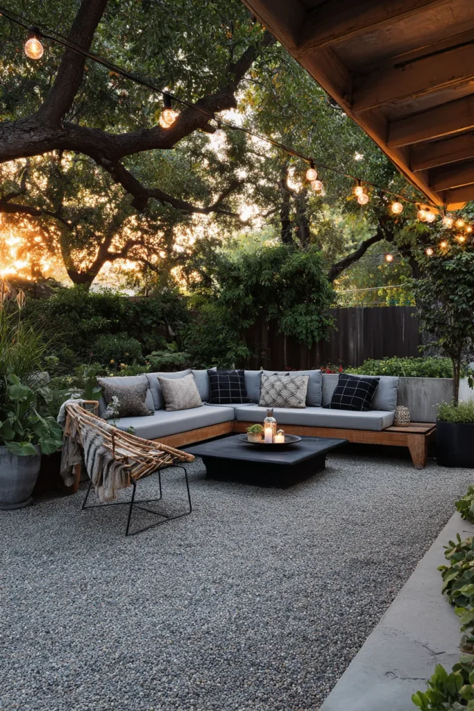 I totally fall in love with how incredibly relaxed and tucked away this outdoor living room feels; it’s like a secret garden escape. I think the combination of the loose gravel with the more defined concrete areas is genius because it adds such a wonderful, earthy texture contrast while keeping the space functional. The strung lights and the cozy fire pit truly complete the mood, making it the absolute ideal spot for snuggling up with friends on a cool evening. It’s such a dreamy design that’s all about simple, natural comfort.