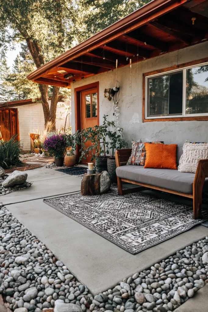 This cozy entry or side patio perfectly blends cottage charm with modern practicality. The home itself is simple and welcoming, featuring warm siding and a covered porch area. The patio floor is a clever mix: a central area is defined by a large outdoor rug placed on a mix of river rock or pebbles, but a clear smooth concrete border is used to frame this area and create a clean walkway leading to the house. This concrete edging keeps the decorative stones contained and provides a clean, stable surface right where you need it most.