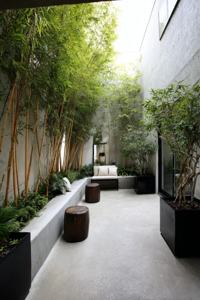 I absolutely adore how incredibly calm and clean this space feels; it’s like stepping into a peaceful sanctuary. The way the tall bamboo softens the look of the concrete walls is just genius and adds such a wonderful, natural element. The simple, geometric concrete steps feel so intentional and modern, giving the whole pathway such an elegant, uncluttered look. It’s truly a beautiful vision for maximizing a tight space and turning it into a minimalist, soothing escape.