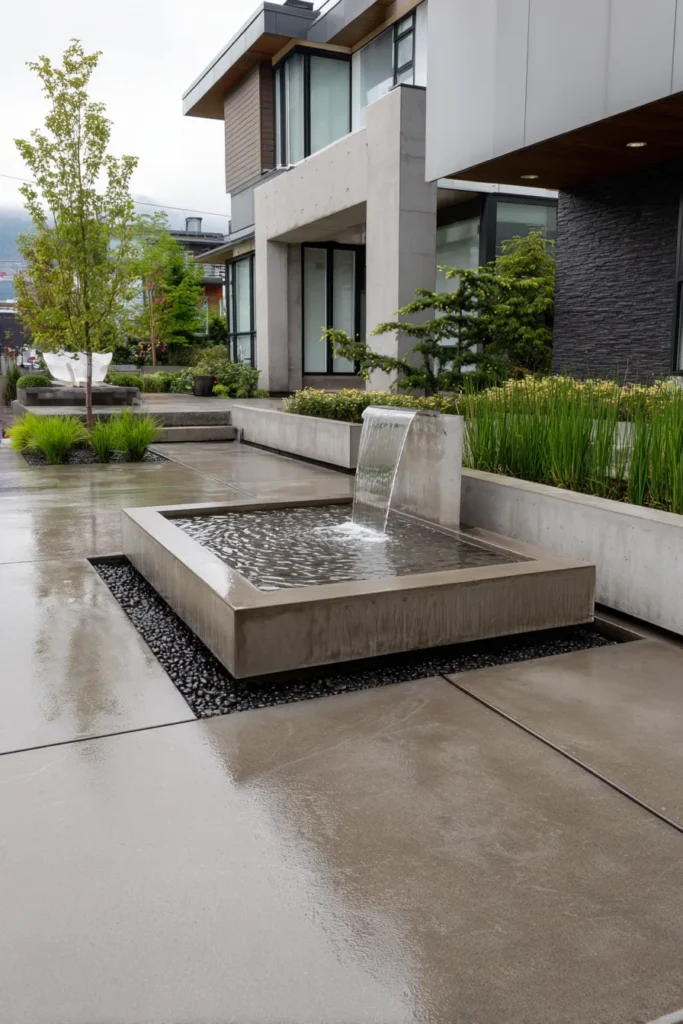 I think this outdoor area is just incredibly sophisticated and architectural; it truly gives off a high-end, custom-designed feel. I especially love the drama of that clean-lined water feature against the dark stone and the surrounding cool concrete. It brings an element of sound and movement to the yard, making the whole space feel dynamic and relaxing at the same time. It’s an impressive and stylish design that proves that concrete can be the ultimate foundation for modern, minimalist luxury.