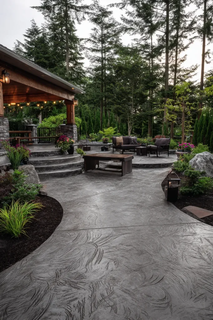 I absolutely adore how sophisticated and earthy this patio feels; it truly looks like it was carved out of the forest floor, not just poured. I think the choice of that deep, textured concrete stamp is genius because it completely hides any imperfections and adds so much character, making it look incredibly expensive and custom-made. The way the design incorporates those soft, curving lines and steps is so welcoming, making you feel like you’re entering a magical outdoor living room. It’s a breathtaking design that is pure outdoor luxury and tranquility.