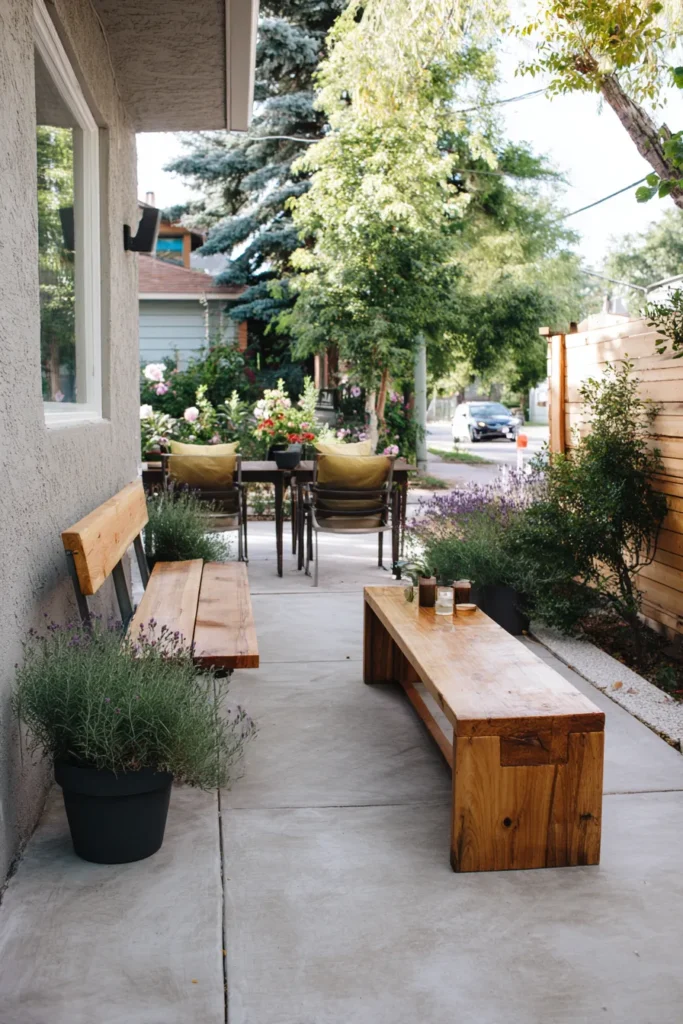 If you’re into a truly seamless look, this patio area is an absolute masterpiece in functional design. I love how the smooth, light-colored concrete just melts into the landscaping, making the yard feel so much bigger and more cohesive. The inclusion of that long wooden bench is such a smart design choice for adding warmth and practicality for hosting a crowd. It’s an inviting, super stylish space that feels perfectly set up for fabulous summer dinner parties and relaxed weekend afternoons.