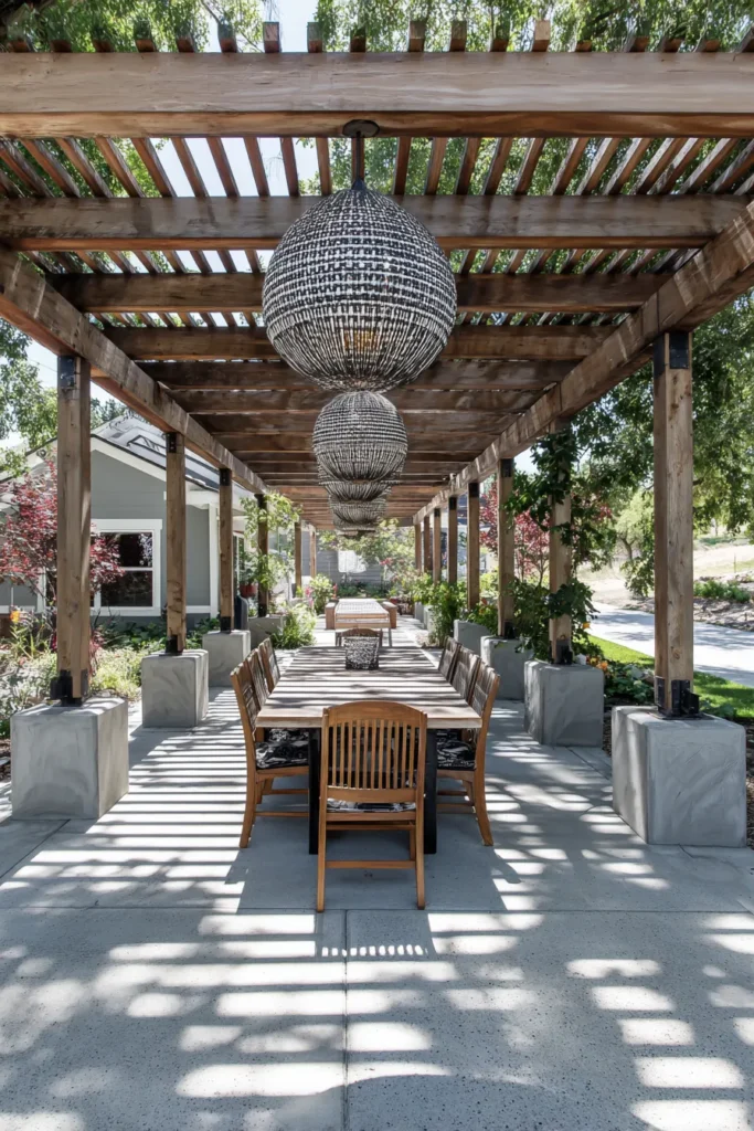 This design focuses heavily on creating a defined, shaded outdoor entertaining area, complementing a home that appears to be contemporary with neutral tones. The highlight is the stunning wooden pergola that completely covers the patio, offering beautiful, dappled light and structure to the space. The floor is a gorgeous large-format, light gray concrete patio that provides a clean, neutral foundation under the dining table and planter boxes. The use of large potted greenery and the intricate hanging light fixture elevates the entire space to resort-level luxury.