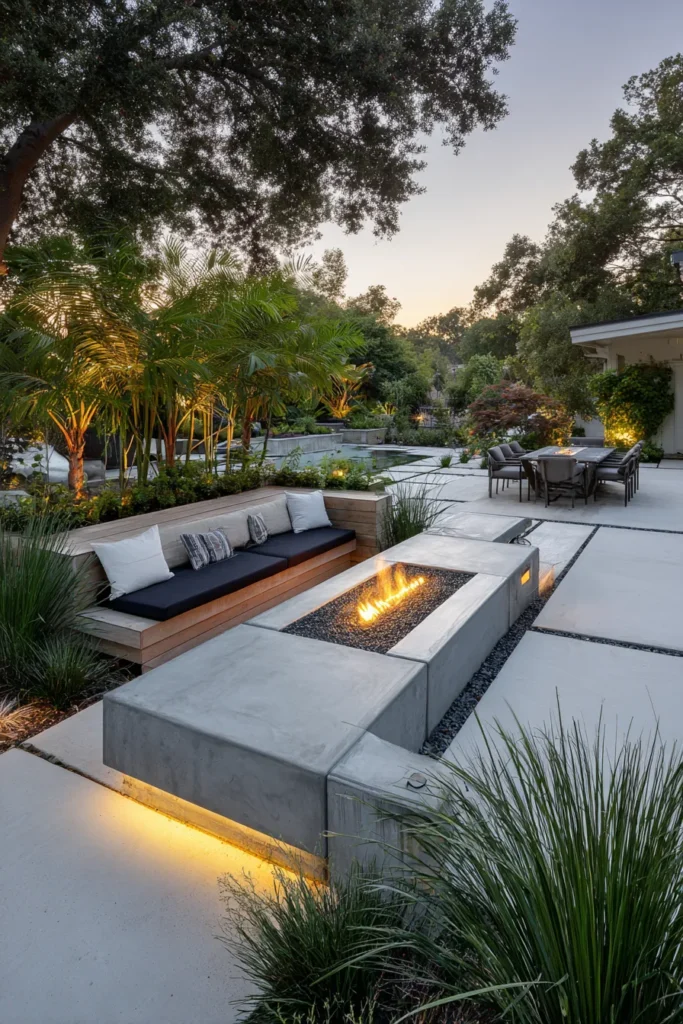 No matter your style, I think the way this space is designed is so incredibly impressive and thoughtfully executed; it screams designer flair. I absolutely adore the low, built-in concrete planters and seating; they make the space feel instantly tidy, cohesive, and sophisticated. The dedicated fire pit area is simply perfect for entertaining, creating a cozy and magical atmosphere when the sun goes down. This is truly a beautiful example of a modern, sophisticated backyard retreat.