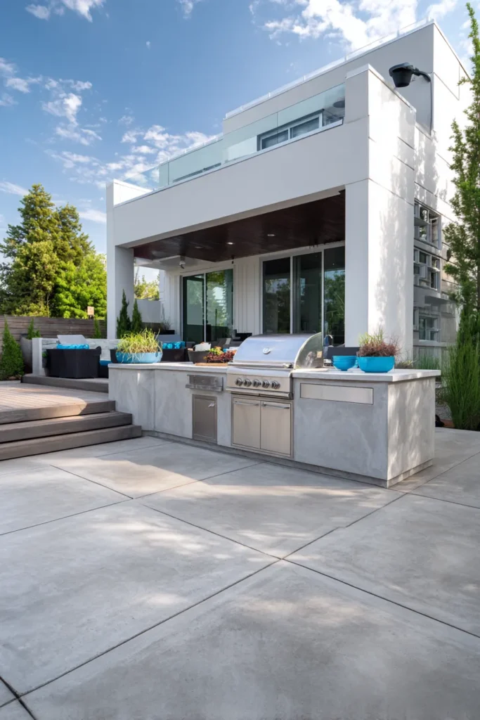 If you’re dreaming of a backyard kitchen, I think this setup is simply fantastic and incredibly inspiring because it looks so polished and high-end. I love how the smooth, light gray concrete patio provides such a clean, modern base that highlights the beautiful kitchen structure. Having that much counter space outside is an absolute dream for hosting summer parties, making everything feel so easy and effortless. This design is the epitome of modern luxury and makes the entire yard feel like a five-star hotel amenity.