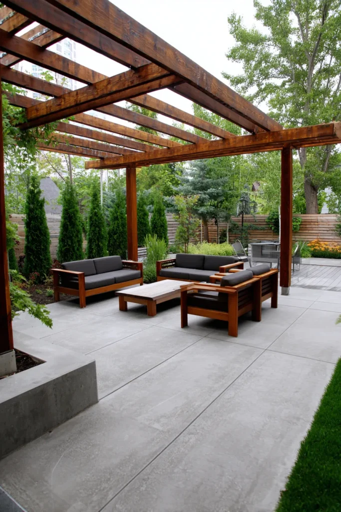 This backyard space is all about creating a chic, dedicated outdoor living room perfect for conversation and relaxation. It features a beautiful, smooth concrete patio foundation that is perfectly level and clean. The highlight is the substantial wooden pergola with deep beams, which defines the space and provides partial shade, giving it a warm, earthy contrast against the pale concrete. Low concrete or stucco planter walls surround the area, adding definition, while simple, contemporary outdoor furniture completes this incredibly stylish, sheltered spot.