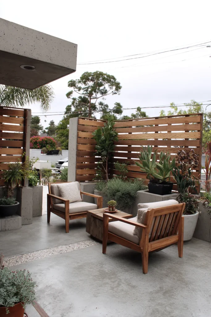 This design cleverly transforms a small, elevated space, like a rooftop deck or an intimate urban backyard, into a private sanctuary. The entire floor is covered in a uniform, light gray concrete patio, which provides a durable, easy-to-maintain surface. The area is defined and protected by slatted wood privacy screens that add essential warmth and a rustic texture to the modern concrete structure. Low-slung, comfortable furniture and potted plants complete the look, making it an ideal, sheltered spot for unwinding.