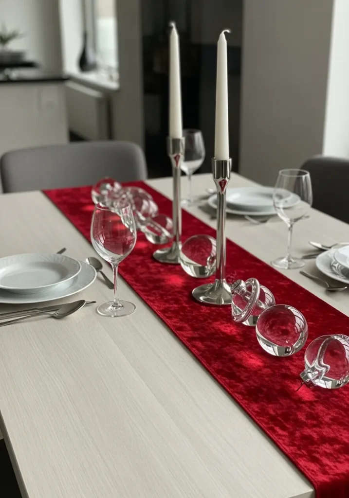 This setting is all about clean sophistication. A soft, velvety red table runner brings warmth and texture to the pale tabletop, perfectly balanced by sleek silver candleholders and delicate glass orbs that shimmer in the light. The overall look feels crisp, festive, and deeply modern, with every piece chosen for its quiet luxury.