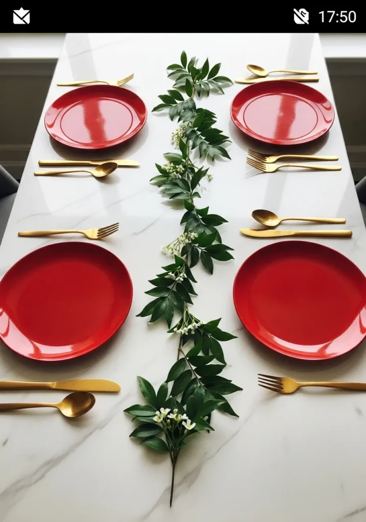 This table practically glows with sophistication. Vivid red plates pop against a white marble table, while gold cutlery and a lush green garland create a luxurious holiday contrast. Every piece feels intentional, blending bold color with refined style.