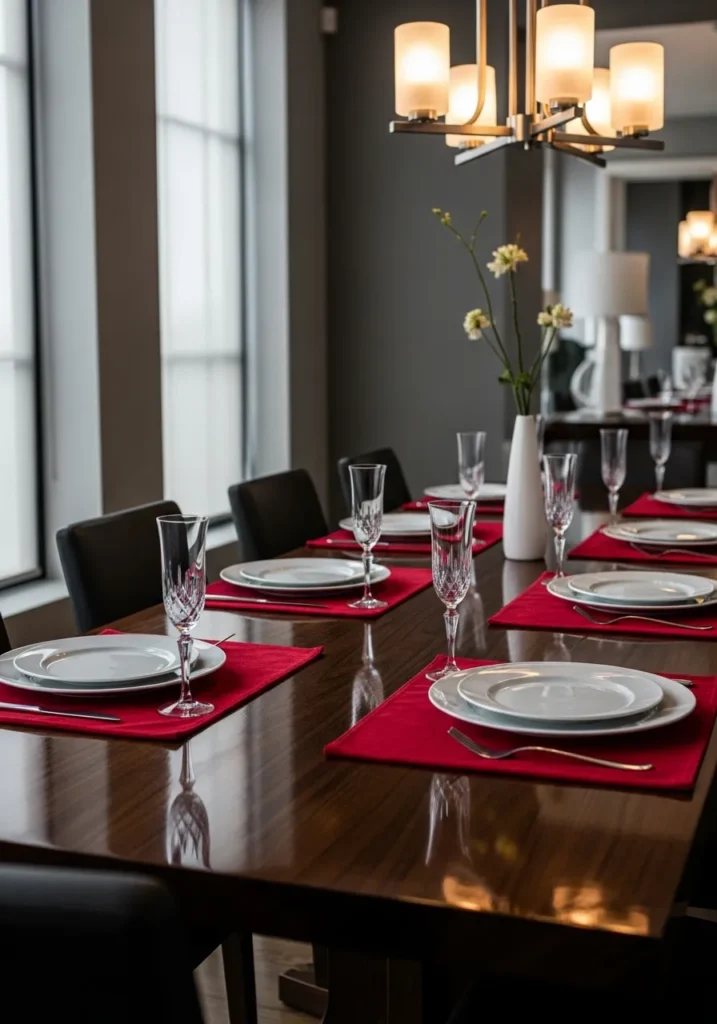 A glossy wooden table becomes a showpiece with bright red placemats and crisp white dishes. The modern chandelier above casts a warm glow, highlighting the sleek lines and contemporary layout. It’s a space that feels elegant and perfectly put together.