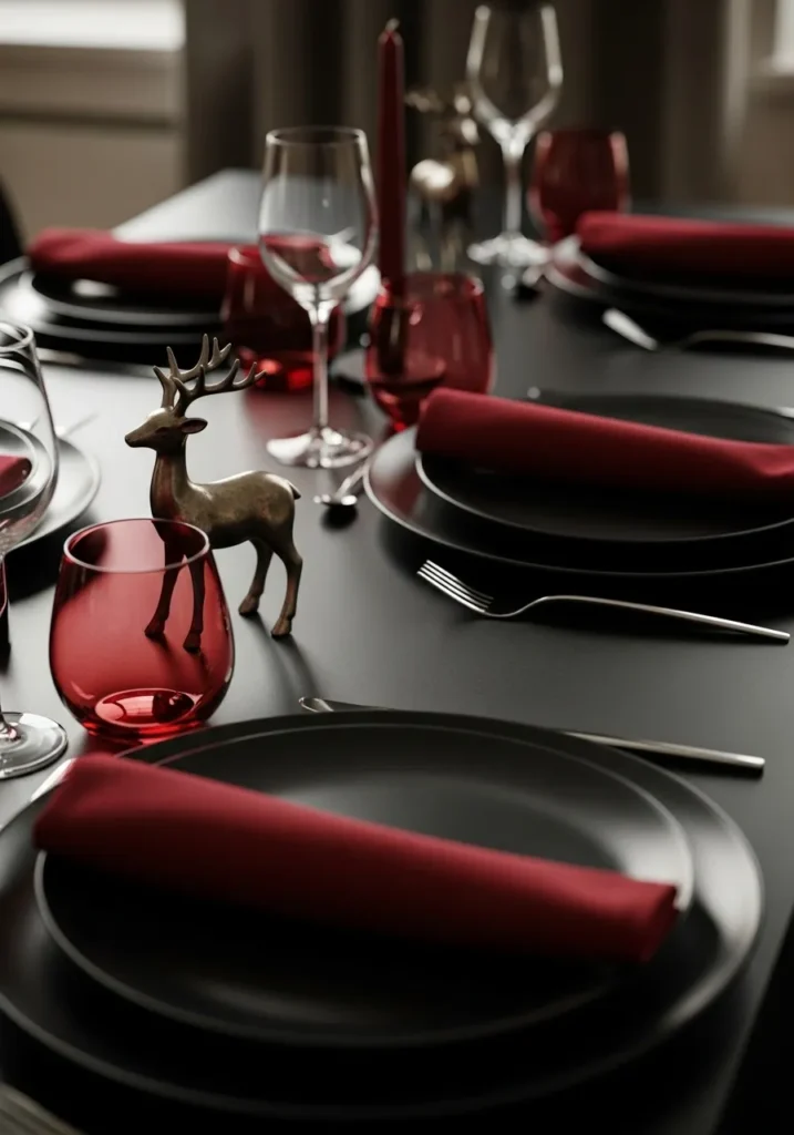 This design takes Christmas decor into a bold new direction. Matte black plates, rich red napkins, and deep ruby glassware create a moody, elegant feel. A few metallic accents, like the small reindeer figurine, bring just enough sparkle to make it festive without losing its modern edge.