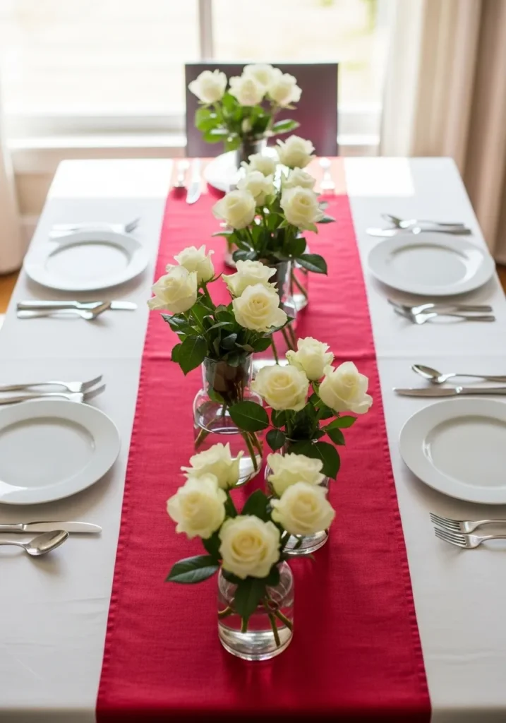 This design is pure romance dressed for Christmas. A bright red table runner anchors the setup, lined with simple glass vases holding fresh white roses. The contrast of red and white feels classic and clean, while the repetition of flowers gives it a polished, symmetrical charm that feels straight out of a designer’s playbook.