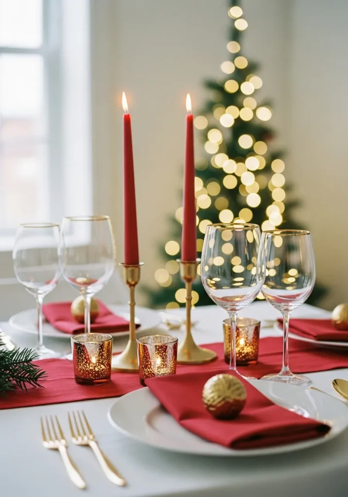 This setting is holiday magic at its most glamorous. A deep red runner stretches down the table, accented with gold flatware, shimmering votive holders, and tall red taper candles in elegant brass stands. The bokeh glow from the Christmas tree in the background adds the dreamiest sparkle.