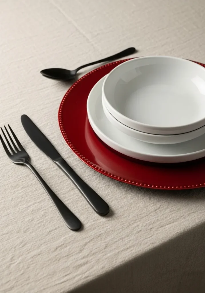 Minimalism meets bold color in this refined table design. A soft beige tablecloth provides a neutral base for matte black flatware and a deep red charger plate with a delicate beaded edge. The clean white dishes stacked on top bring a modern, layered look that feels sleek and intentional.