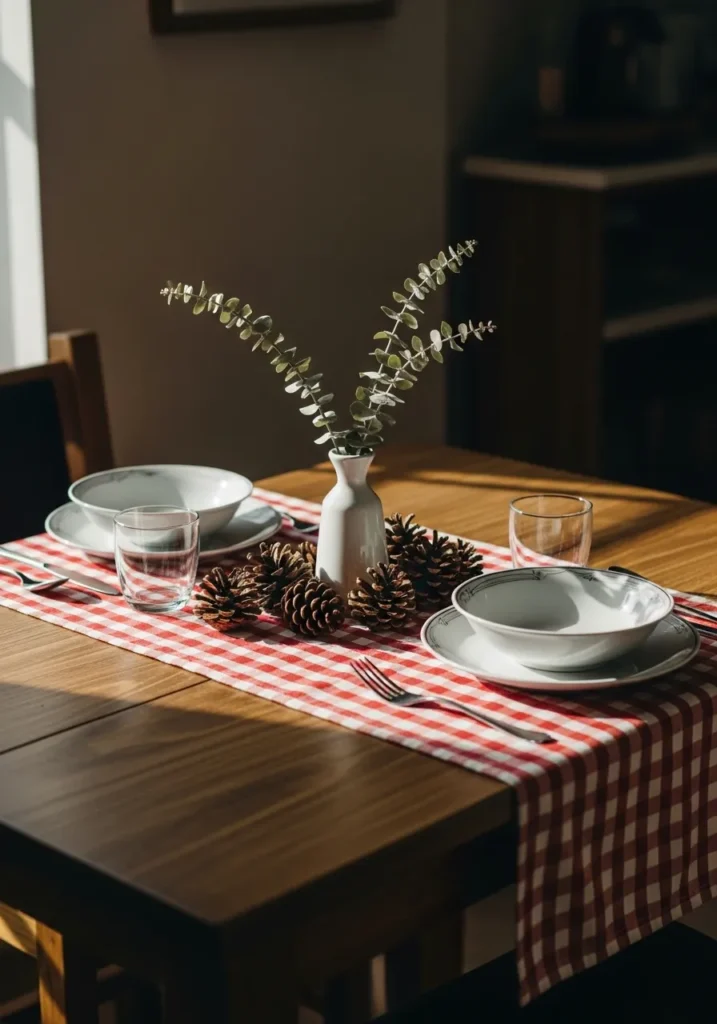 This table gives cozy cabin energy with a touch of vintage cheer. A red and white gingham runner brings personality to the wooden table, while pinecones and eucalyptus branches add texture and natural beauty. The soft sunlight makes everything look golden and welcoming.