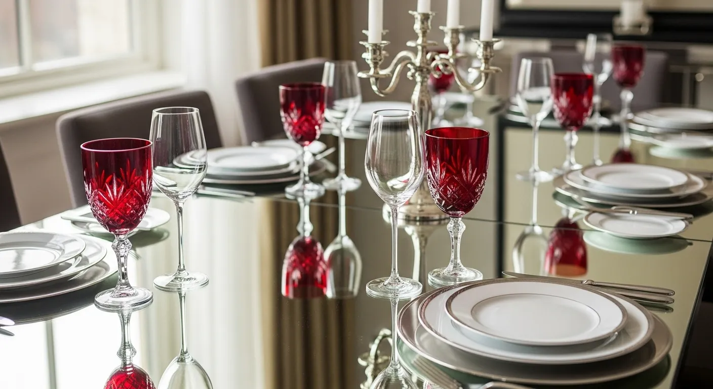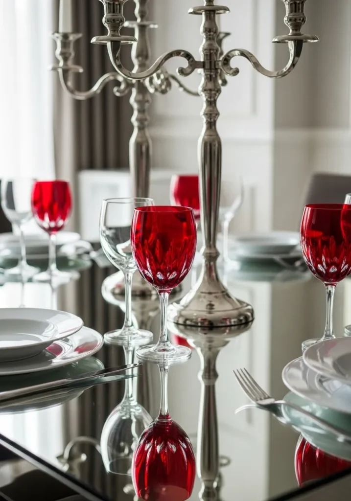 This setup is the definition of festive luxury. A mirrored table reflects the shine of ornate silver candelabras and deep red glassware, creating a rich, layered glow. The white plates keep it grounded, but the reflections and textures make it feel straight out of a holiday editorial.