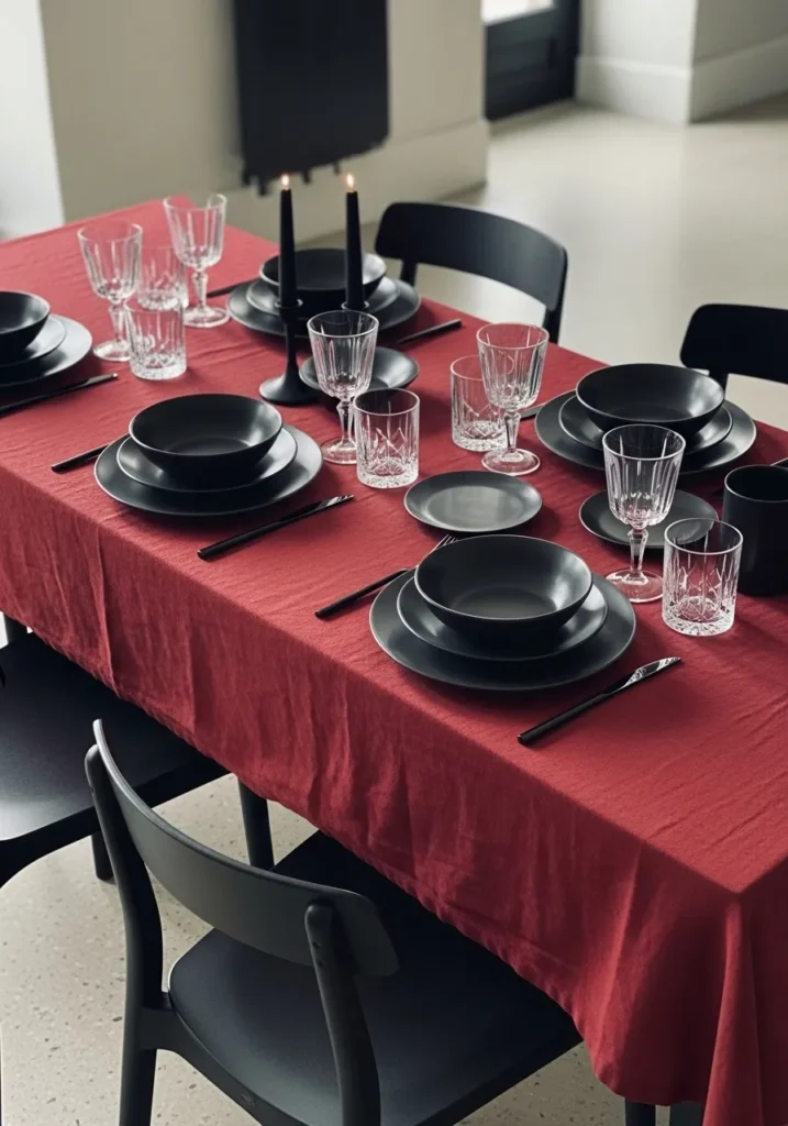This design is bold, moody, and completely on-trend. A deep red tablecloth sets the tone for sleek black plates, cutlery, and chairs. Crystal glassware adds sparkle against the dark palette, creating a perfect balance of modern minimalism and festive flair.