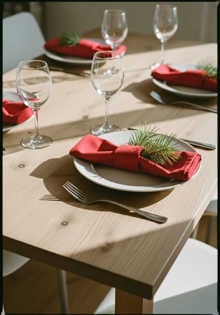 Here’s a perfect example of understated holiday charm. A natural wood table paired with red napkins and a hint of evergreen sprigs feels both cozy and refined. The sunlight streaming through adds warmth, turning a simple setup into something effortlessly festive.