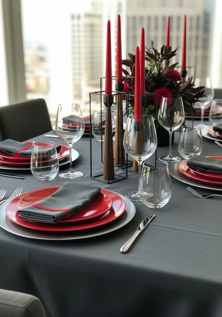 This setting screams city sophistication. Deep charcoal linens set a moody base, while layers of red and gray dinnerware create a sleek, balanced contrast. Red taper candles rise dramatically from modern black holders, bringing a little architectural flair to the table.