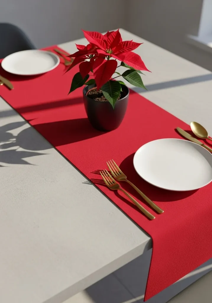 Simplicity meets style in this modern red table runner setup. A single poinsettia in a matte black pot takes center stage, surrounded by clean white plates and golden flatware that add just the right amount of shine. The balance of color and restraint makes it quietly elegant.