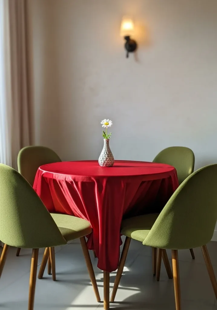 A round table draped in red fabric feels instantly warm and inviting, especially with soft olive green chairs that bring a touch of earthiness to the space. A simple vase with a single daisy sits at the center, reminding us that sometimes less truly is more.