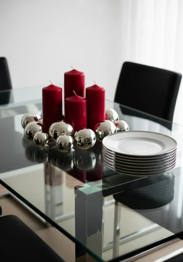 Glass and metal steal the show in this clean, contemporary setup. A cluster of glossy red pillar candles surrounded by reflective silver ornaments adds depth and shine to a glass table, creating a look that feels both luxurious and minimal.