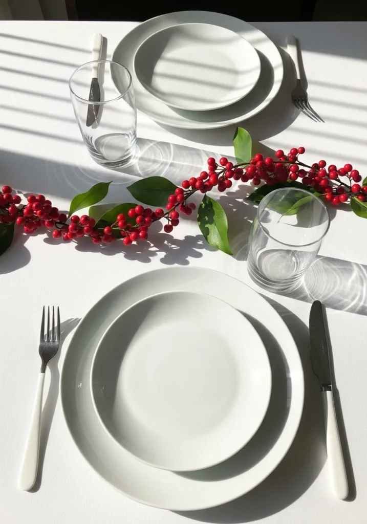 This table captures the magic of simplicity. A crisp white tablecloth sets the perfect backdrop for a delicate strand of red berries and green leaves, creating a light and modern holiday look. The clean white plates and clear glassware keep everything airy and fresh, letting the natural colors pop beautifully in the sunlight.