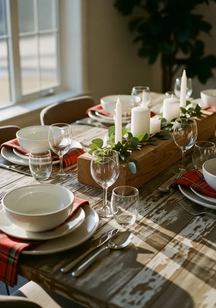 This cozy setup blends rustic charm with timeless Christmas style. A weathered wooden table pairs beautifully with white dinnerware, red plaid napkins, and a wooden candle centerpiece filled with greenery and soft white candles. The warm sunlight gives everything a golden glow, making it feel like the perfect countryside Christmas scene.