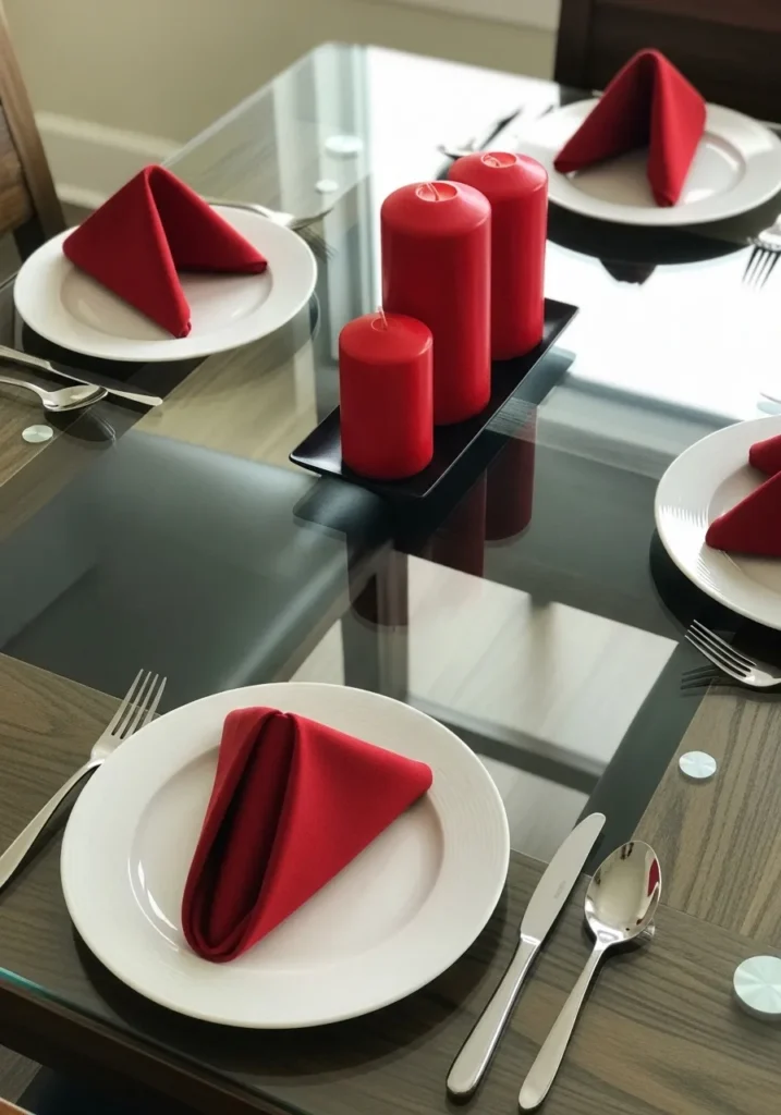 A glass dining table gets a dramatic touch with this clean and structured arrangement. Red napkins folded neatly atop white plates mirror the trio of bold red candles in the center. The transparent surface and sleek silverware keep the overall look sharp, minimal, and distinctly modern.