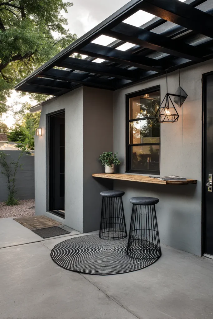This compact pergola corner doubles as a sleek outdoor bar area, complete with a floating counter and modern stools. The matte black frame and soft lighting keep everything feeling clean and contemporary.