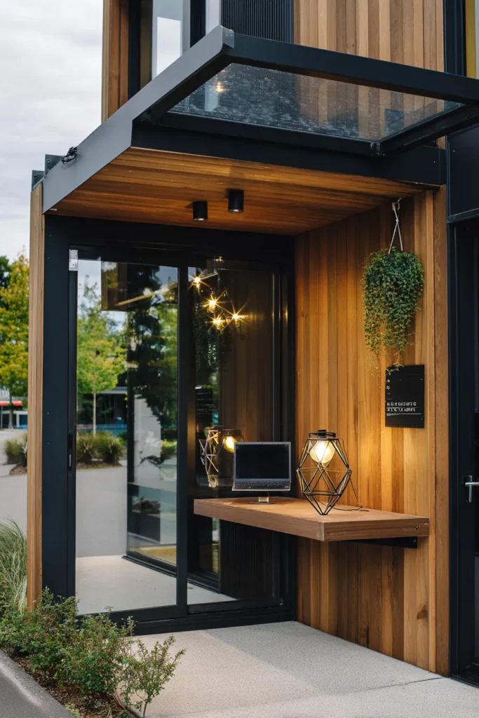 A smart little pergola turns into an outdoor workspace here, blending wood tones with glass and metal details. The hanging plants soften the look, making it feel professional yet homey.