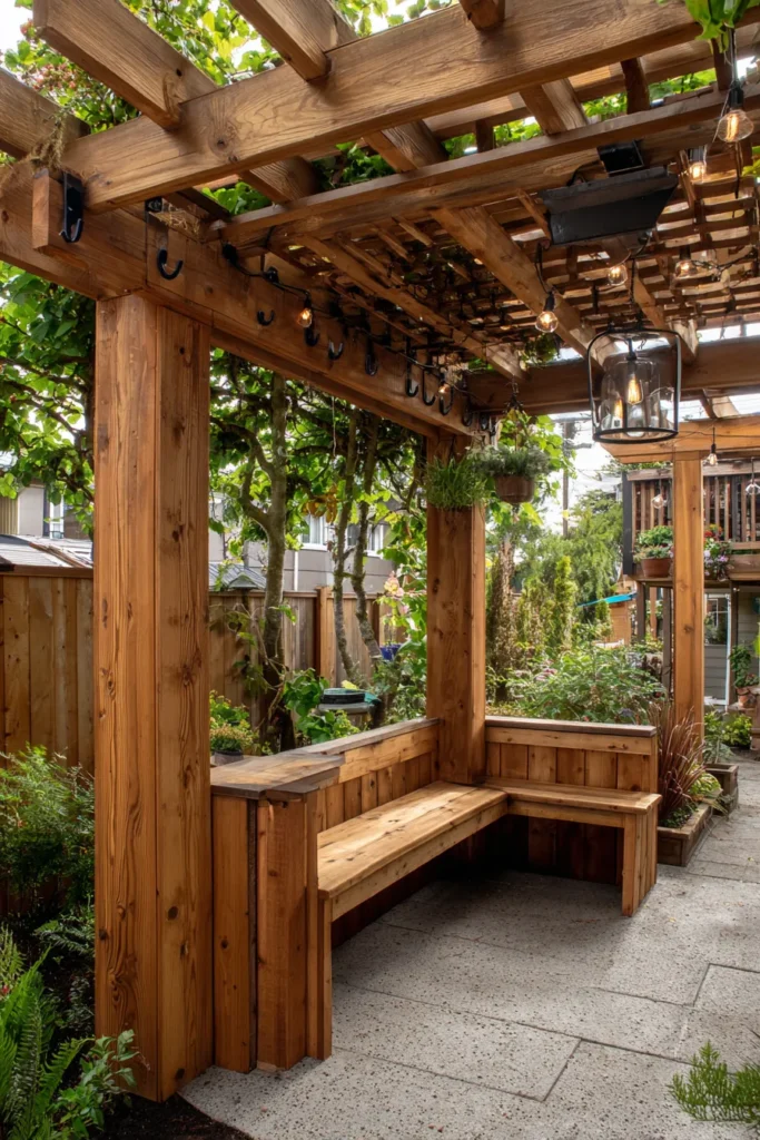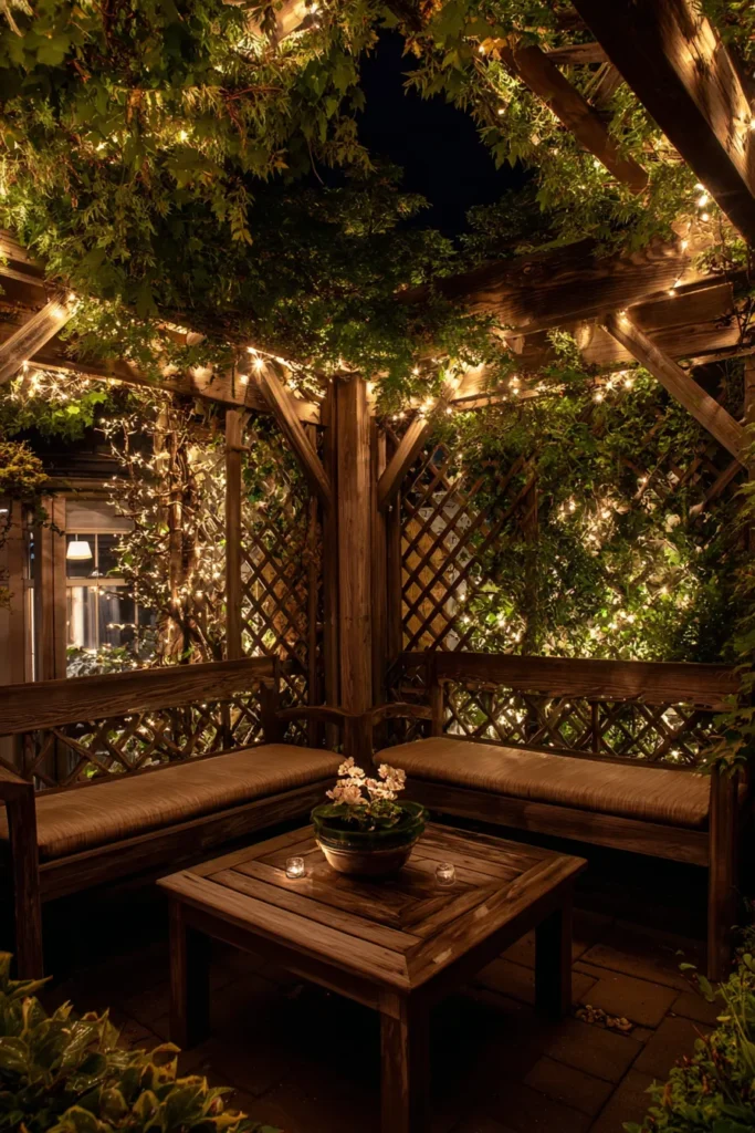Warm wood tones, hanging lights, and lattice walls create a snug little evening retreat. The pergola’s structure is compact but rich in texture, making it ideal for intimate chats or quiet moments under the stars.