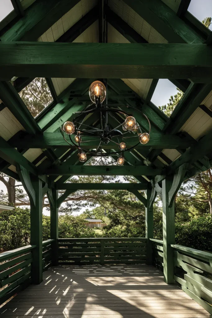 Deep green beams, a vaulted roof, and a hanging chandelier make this pergola look grand without being over the top. The shaded space feels lush and inviting, perfect for garden parties or quiet reflections.
