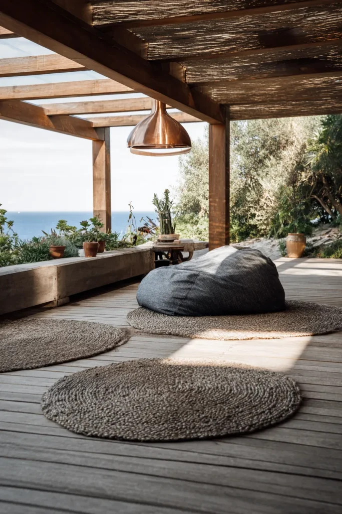 Soft wood textures, comfy floor cushions, and an ocean view make this pergola a true coastal dream. The open layout lets the breeze roll through while still offering shade and comfort.